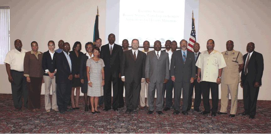 | Left to Right: Dwayne Curtis, DEHS, Coral Miller, Ministry of The Environment, Katherine Malpelli, USGS Assistant Training Instructor, Edison Deleveaux, Marine Resources, Burlington Strachan, BEC, Antonique Sweeting, BNGIS Centre, , Carolann Albury, Director, BNGIS Centre, Jean Weaver, International Program Coordinator USGS, Peter Chirico, USGS Training Instructor, Captain Stephen Russell, Director, NEMA, Mr. Lavarity, RBPF, Timothy Zuniga-Brown, Deputy Chief of Mission, U.S. Embassy, Brent Marshall, BTC, Hon. Phenton Neymour, M.P., Ministry of The Environment with responsibility for the BNGIS Centre, Bradley King, MOW, Randy Taylor, GBPA, Daniel Hansen, U.S. Northern Command, Michael Braynen, Director, Department of Marine Resources, Dwight Allen, DEHS, John Ferguson, Deputy Commissioner and Duane Miller, BNGIS Centre |
